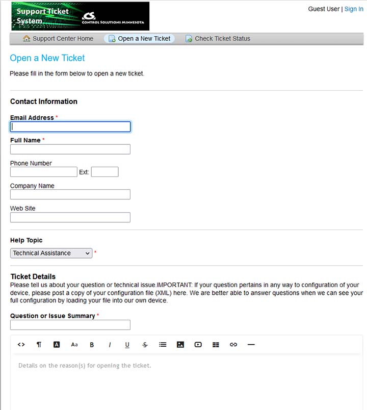 Use the support ticket to contact us with general inquiries, sales questions, or for technical support. You will receive an email confirming receipt of your inquiry along with a link to log into the support system. You will also receive an email when a response to your inquiry is provided by the support staff.