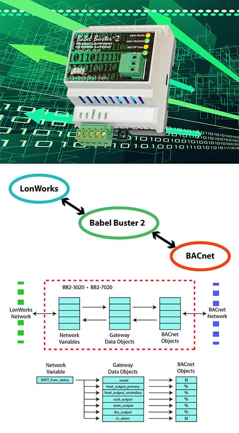 LonWorks to BACnet gateways, or protocol converters, translate LonWorks network variables into BACnet objects and translate BACnet objects into LonWorks network variables. The Babel Buster gateways will connect BACnet MS/TP or BACnet IP devices to a LonWork Free Topology network. The Babel Buster gateways will also connect LonWorks devices to a BACnet IP or BACnet MS/TP network.