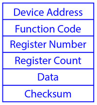 Modbus data is most often read and written as "registers" which are 16-bit pieces of data. Most often, the register is either a signed or unsigned 16-bit integer. If a 32-bit integer or floating point is required, these values are actually read as a pair of registers. The most commonly used register is called a Holding Register, and these can be read or written. The other possible type is Input Register, which is read-only.