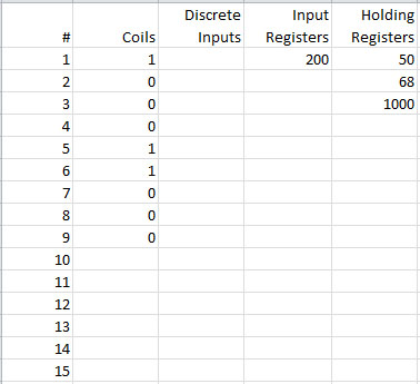 The exceptions to registers being 16 bits are the coil and the discrete input, which are each 1 bit only. Coils can be read or written, while discrete inputs are read-only. Coils are usually associated with relay outputs.