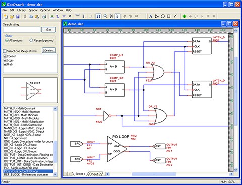 The i.CanDrawIt® visual programming tool is available at no additional cost with every ValuPoint controller from Control Solutions. i.CanDrawIt works just like an electrical schematic CAD program, except you draw control programs that look like circuits. The resulting software will function like the circuit you draw. i.CanDrawIt includes visual program simulation as well as visual live debugging where supported by the target device.