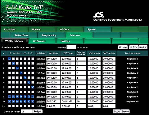 ValuPoint IoT Edge Servers and Babel Buster IoT Gateways support local real time scheduling. Scheduling is done in a very generic and simple way. A register or object you select will change value according to a schedule you provide. From there, you can use the client to write that register to some external Modbus or BACnet device to cause action according to your schedule.