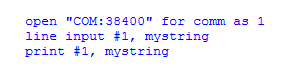 A more complete and complex example is illustrated below. This screen shot shows the View/Edit view of an application in which a proprietery ASCII protocol is being translated to values in local registers (or objects). The line that begins with "print #1" is sending a command to the ASCII device, the "line input" retrieves the reply (waiting for up to 0.5 seconds as defined by the timeout command). Then standard Basic string functions are used to parse the reply.